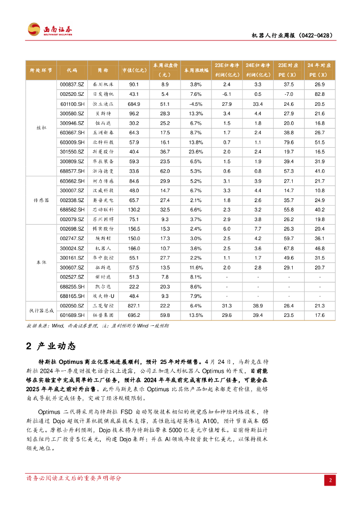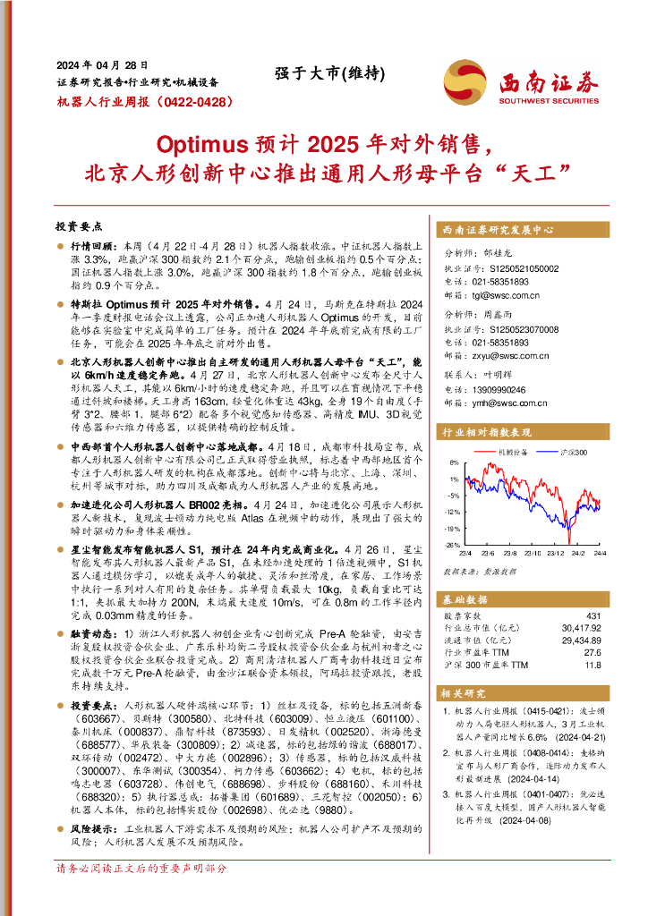 西南证券:机器人行业周报:Optimus预计2025年对外销售,北京人形创新中心推出通用人形母平台“天工”.pdf