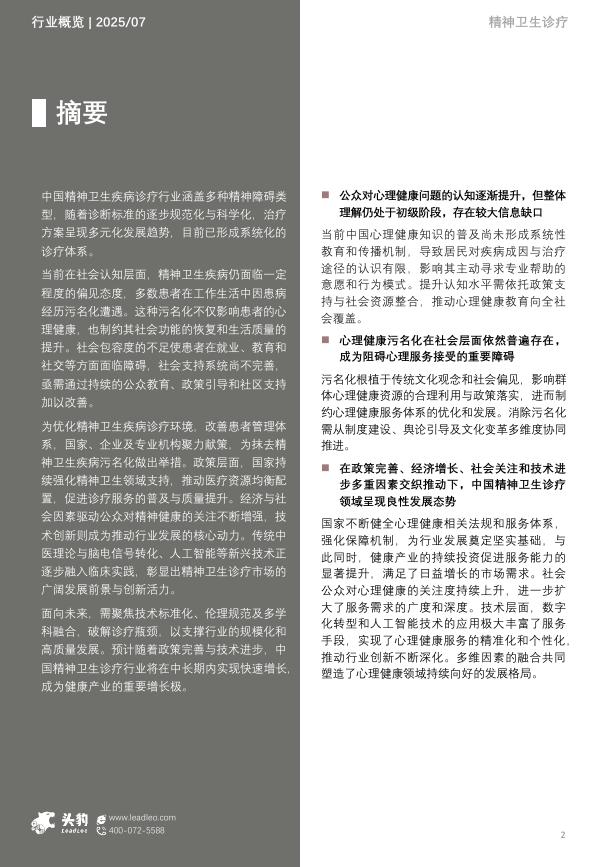 头豹研究院:2025年中国精神卫生疾病诊疗行业:从“缺乏认知”迈向“社会共识”,医疗资源配置的充足与均等化发展逐步抹去精神卫生疾病污名.pdf