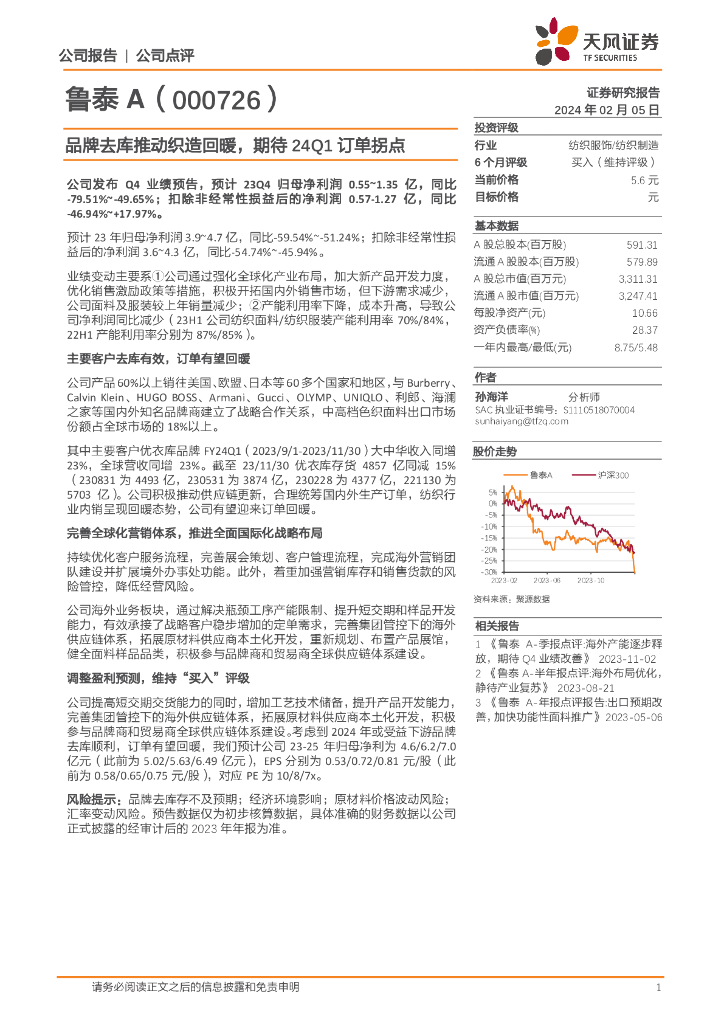 天风证券:鲁泰A(000726)-品牌去库推动织造回暖,期待24Q1订单拐点.pdf