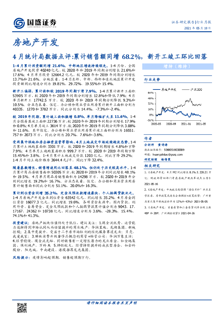 国盛证券:房地产开发行业月报:4月统计局数据点评:累计销售额同增68.2%,新开工竣工环比回落.pdf