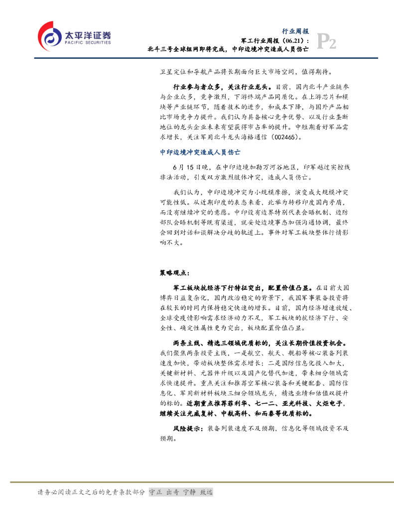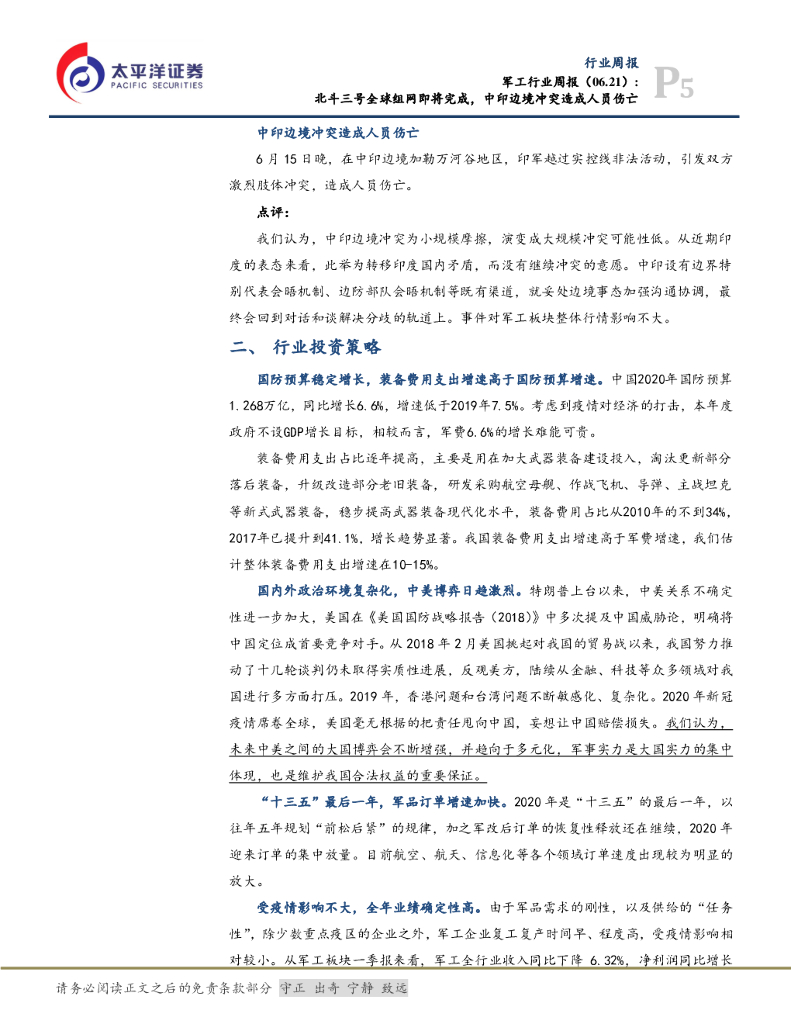 太平洋证券:军工行业周报:北斗三号全球组网即将完成,中印边境冲突造成人员伤亡.pdf
