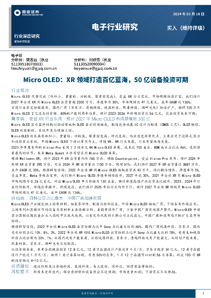 国金证券:电子行业研究:Micro OLED:XR领域打造百亿蓝海,50亿设备投资可期.pdf