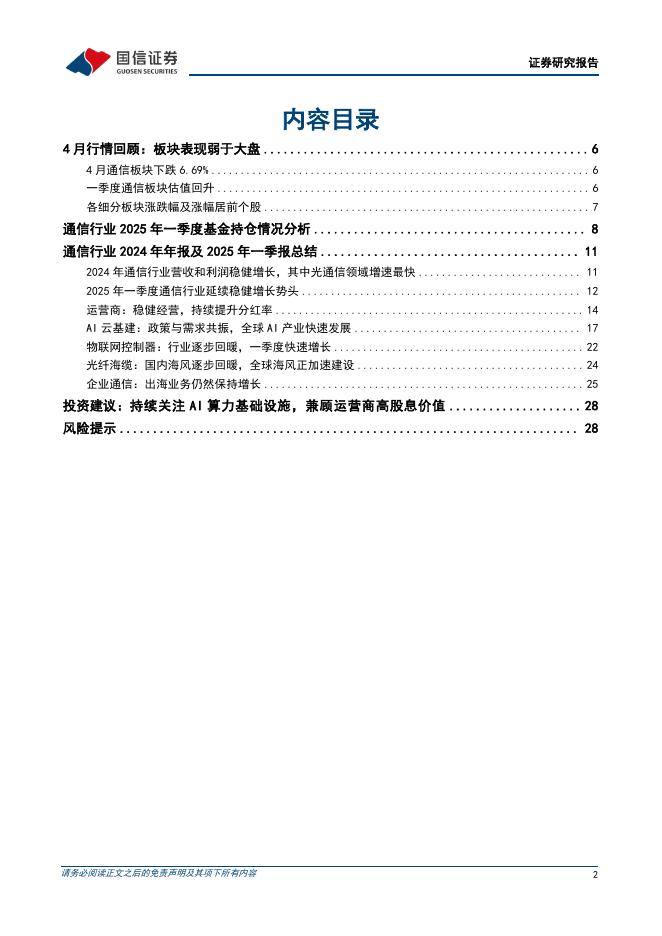 国信证券:通信行业2024年及2025年Q1经营总结分析:运营商稳健发展,AI产业高景气拉动光通信增长.pdf