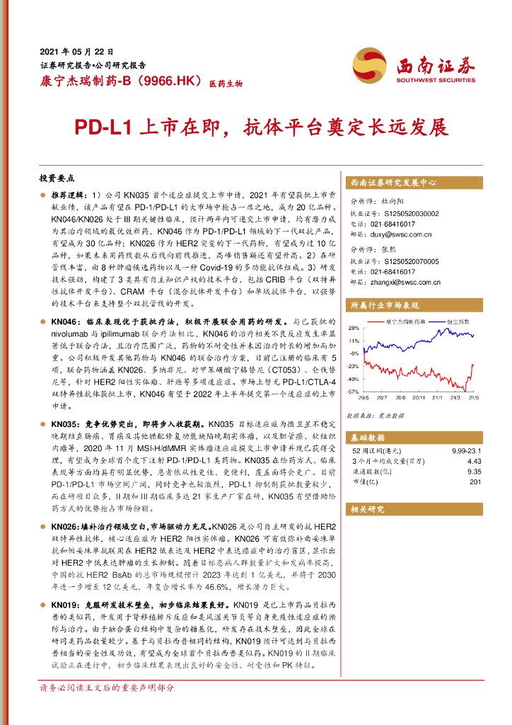 西南证券:康宁杰瑞制药-B(09966)港股公司研究报告-PD-L1上市在即,抗体平台奠定长远发展.pdf