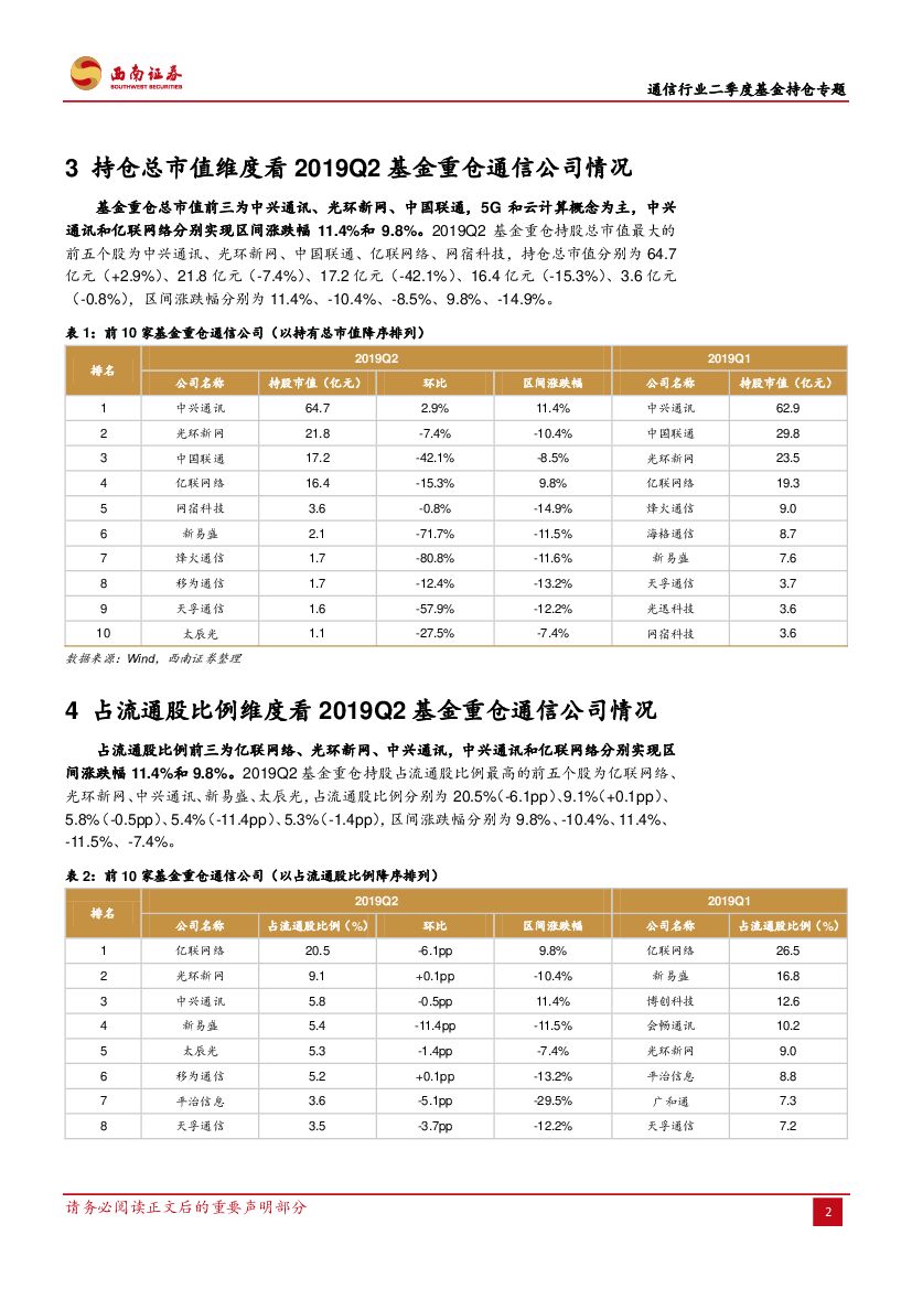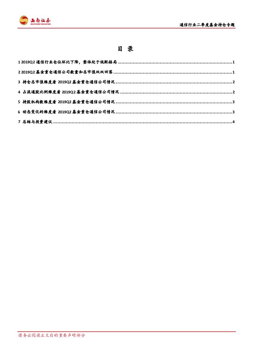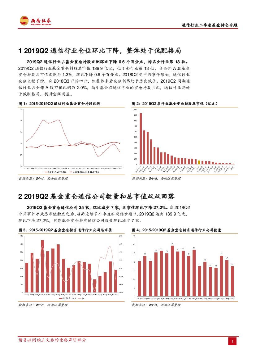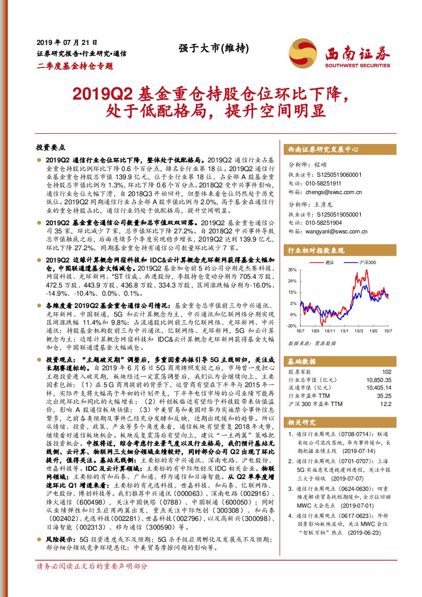 西南证券:通信:2019Q2基金重仓持股仓位环比下降,处于低配格局,提升空间明显.pdf