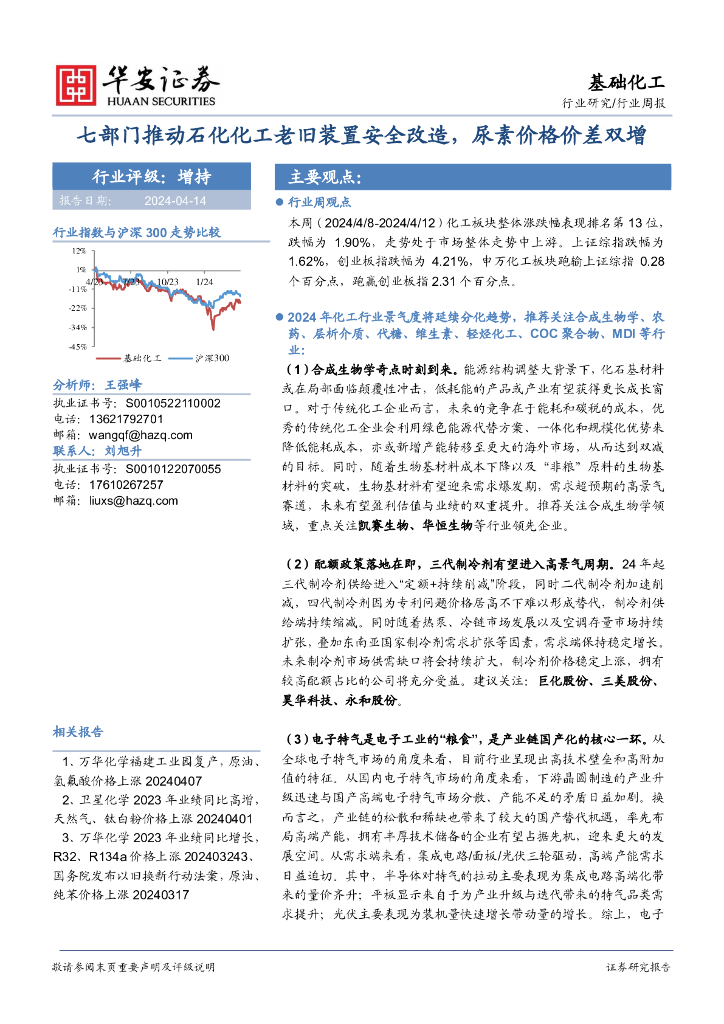 华安证券:基础化工行业周报:七部门推动石化化工老旧装置安全改造,尿素价格价差双增.pdf