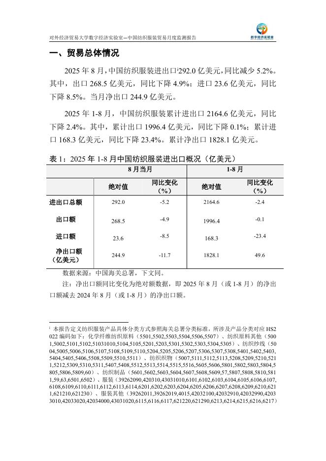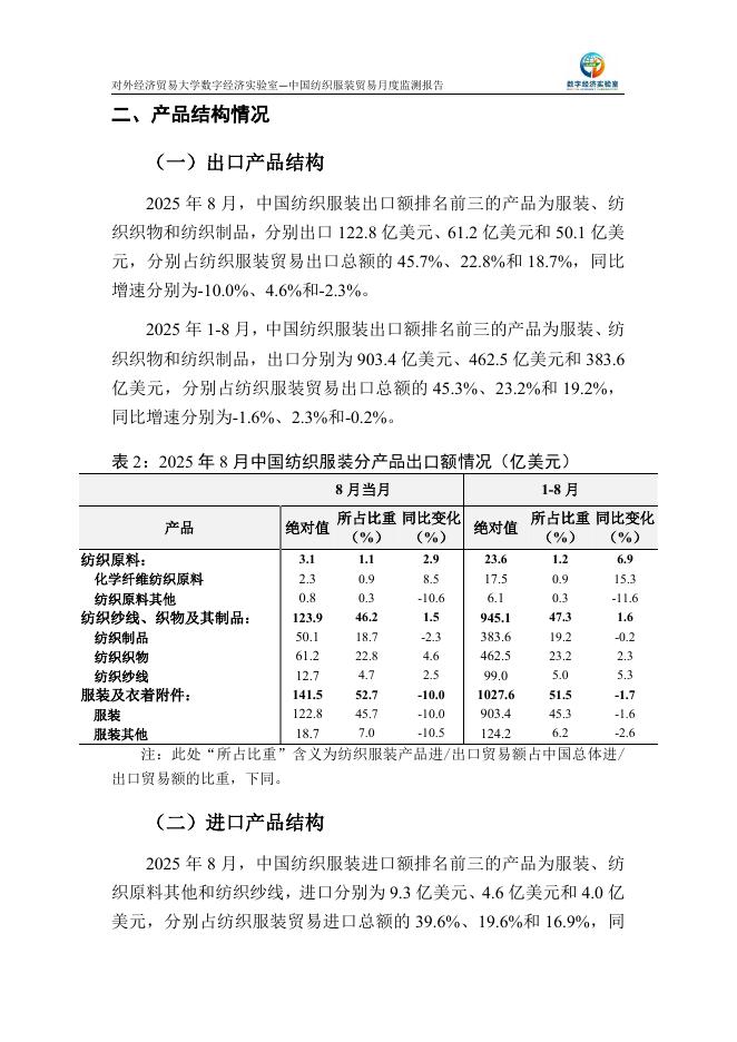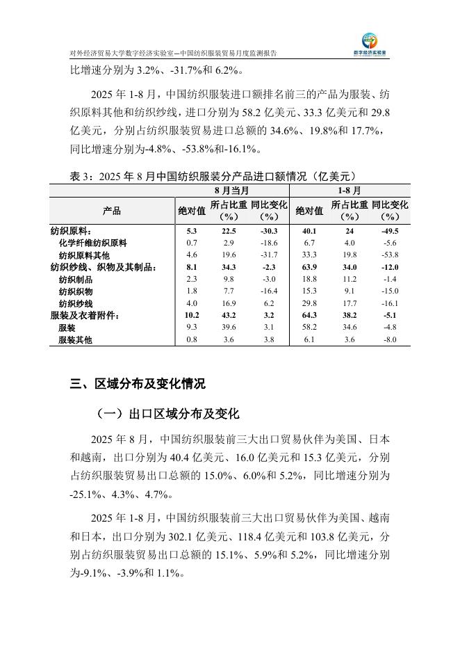 对外经济贸易大学:中国纺织服装贸易月度监测报告(2025年1-8月).pdf