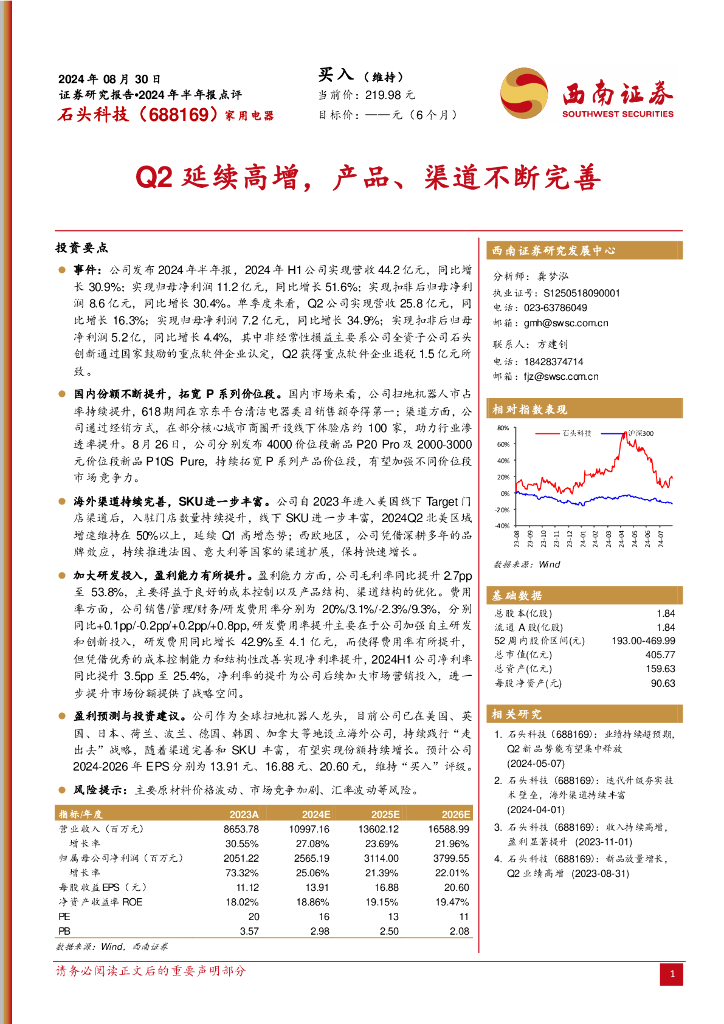 西南证券:石头科技(688169)-2024年半年报点评:Q2延续高增,产品、渠道不断完善.pdf
