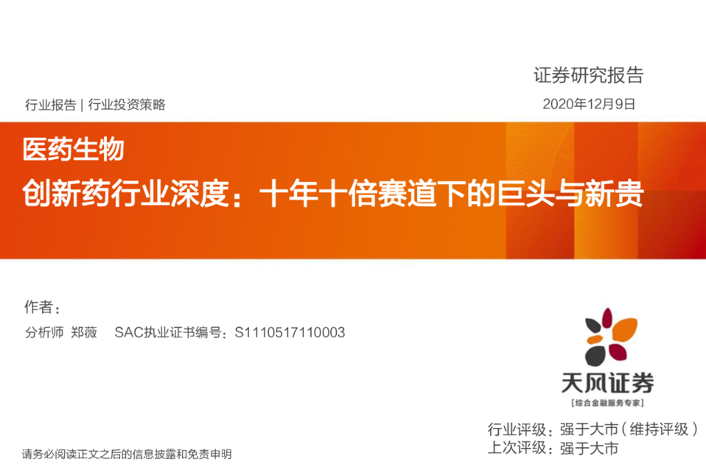 天风证券:医药生物:创新药行业深度:十年十倍赛道下的巨头与新贵.pdf