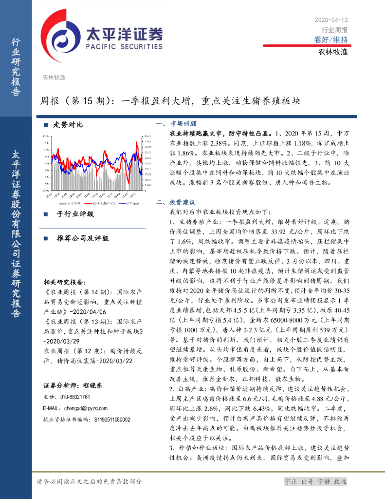 太平洋证券:农林牧渔行业周报(第15期):一季报盈利大增,重点关注生猪养殖板块.pdf