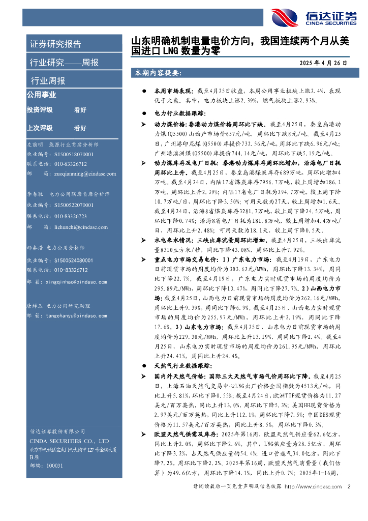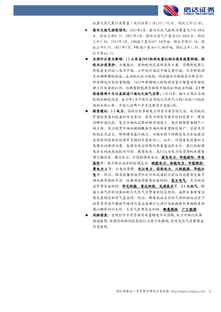 信达证券:电力天然气周报:山东明确机制电量电价方向,我国连续两个月从美国进口LNG数量为零.pdf