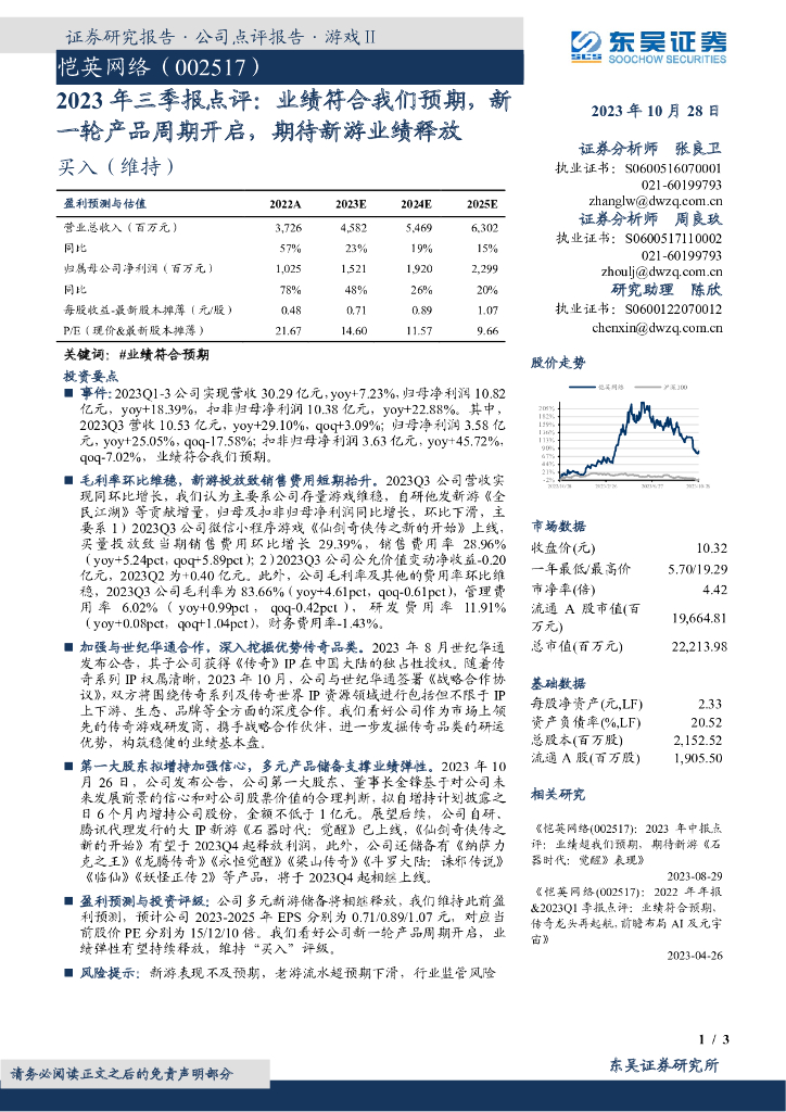 东吴证券:恺英网络(002517)-2023年三季报点评:业绩符合我们预期,新一轮产品周期开启,期待新游业绩释放.pdf