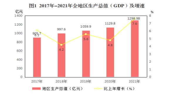 根据地区生产总值统一核算结果,全年实现地区生产总值(GDP)1298.98亿元,比上年增长7.6%,两年平均增长6.2%。其中,第一产业增加值387.03亿元,增长7.7%;第二产业增加值