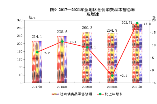 全年社会消费品零售总额302.71亿元,比上年增长18.8%。按经营地统计,城镇消费品零售额222.69亿元,增长20.8%;乡村消费品零售额80.02亿元,增长13.6%。按消费类型统计,商品零售额262.10亿元,增长19.3%;餐饮收入额40.61亿元,下降15.8%。按规模划分,限额以上单位消费品零售额91.67亿元,增长20.7%;限额以下单位消费品零售额211.04亿元,增长18.0%。