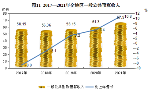 全年一般公共预算收入完成67.90亿元,比上年增长10.8%。其中,税收收入40.76亿元,增长23.2%。一般公共预算支出748.75亿元,下降8.6%。
