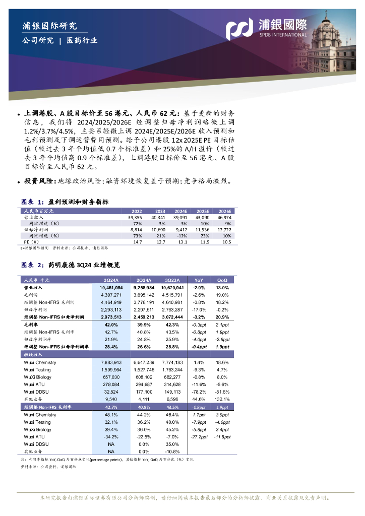 浦银国际证券:药明康德(603259)-3Q24经调整归母净利略高于预期,维持全年收入利润指引.pdf