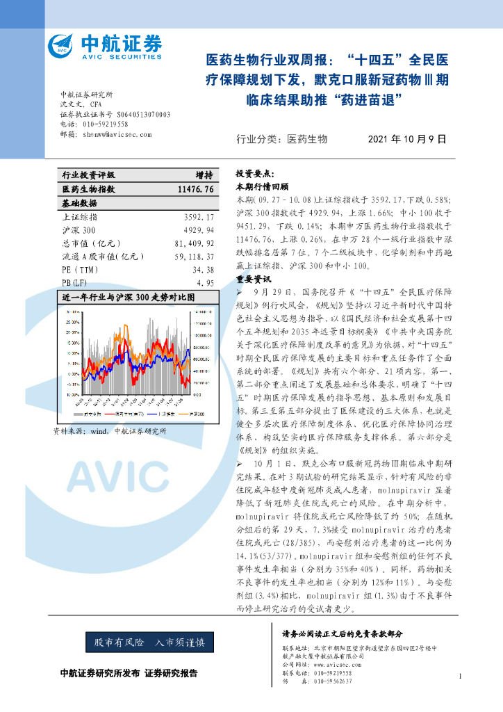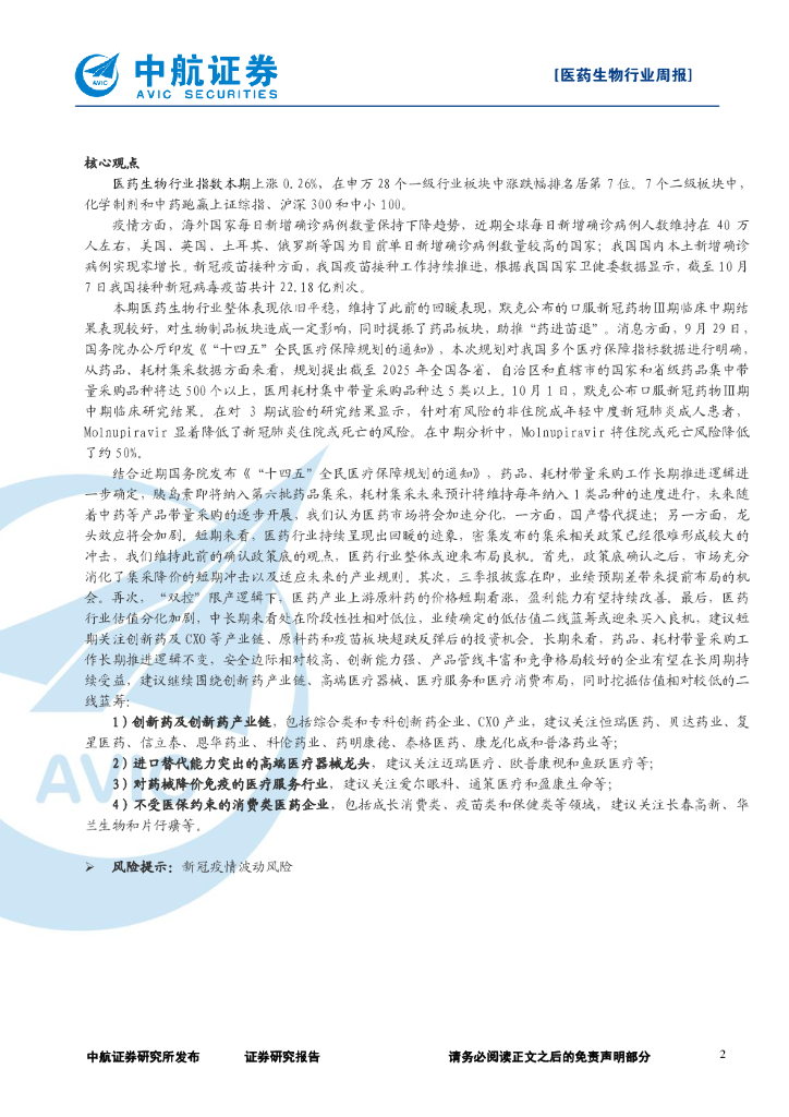 中航证券:医药生物行业双周报:“十四五”全民医疗保障规划下发,默克口服新冠药物Ⅲ期临床结果助推“药进苗退”.pdf