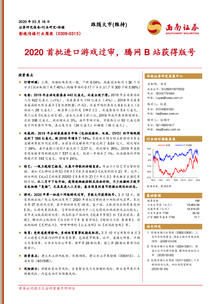 西南证券:影视传媒行业周报:2020首批进口游戏过审,腾网B站获得版号.pdf