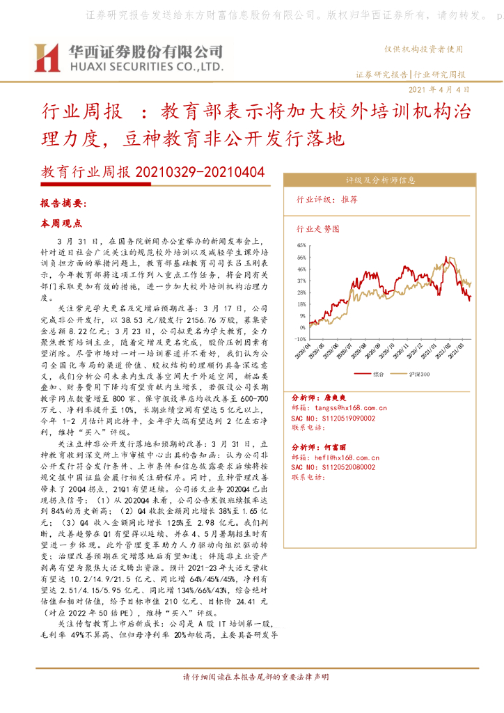 华西证券:教育行业周报:教育部表示将加大校外培训机构治理力度,豆神教育非公开发行落地.pdf