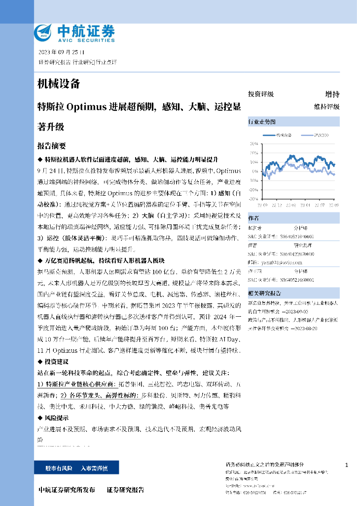 中航证券:机械设备:特斯拉Optimus进展超预期,感知、大脑、运控显著升级.pdf