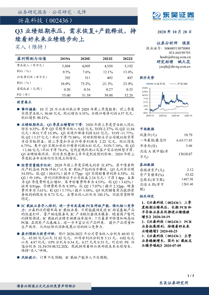 东吴证券:兴森科技(002436)-Q3业绩短期承压,需求恢复+产能释放,持续看好未来业绩稳步向上.pdf