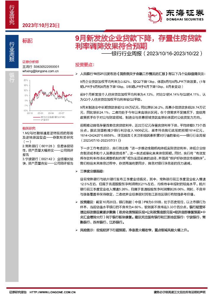 东海证券:银行行业周报:9月新发放企业贷款下降,存量住房贷款利率调降效果符合预期.pdf