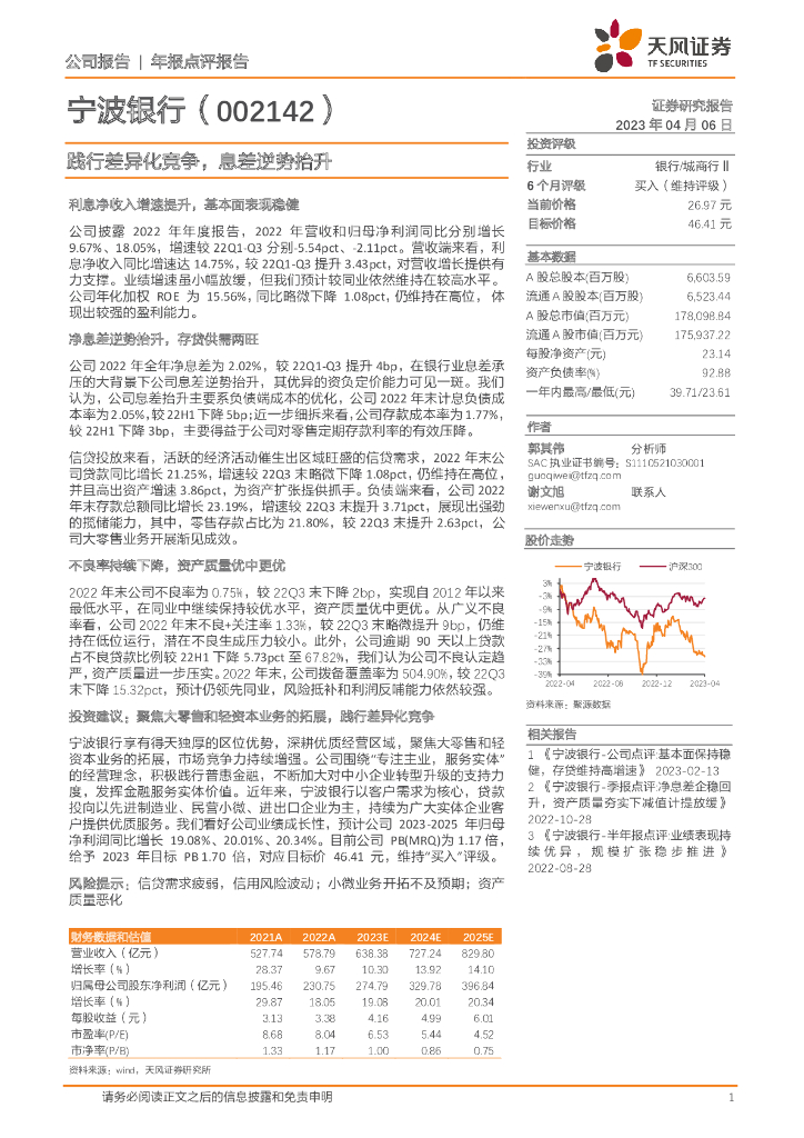 天风证券:宁波银行(002142)-践行差异化竞争,息差逆势抬升.pdf