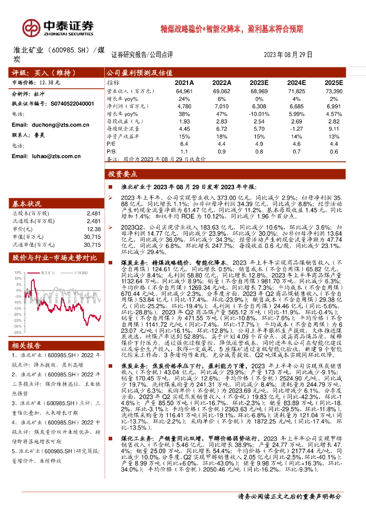 中泰证券:淮北矿业(600985)-精煤战略稳价+智能化降本,盈利基本符合预期.pdf