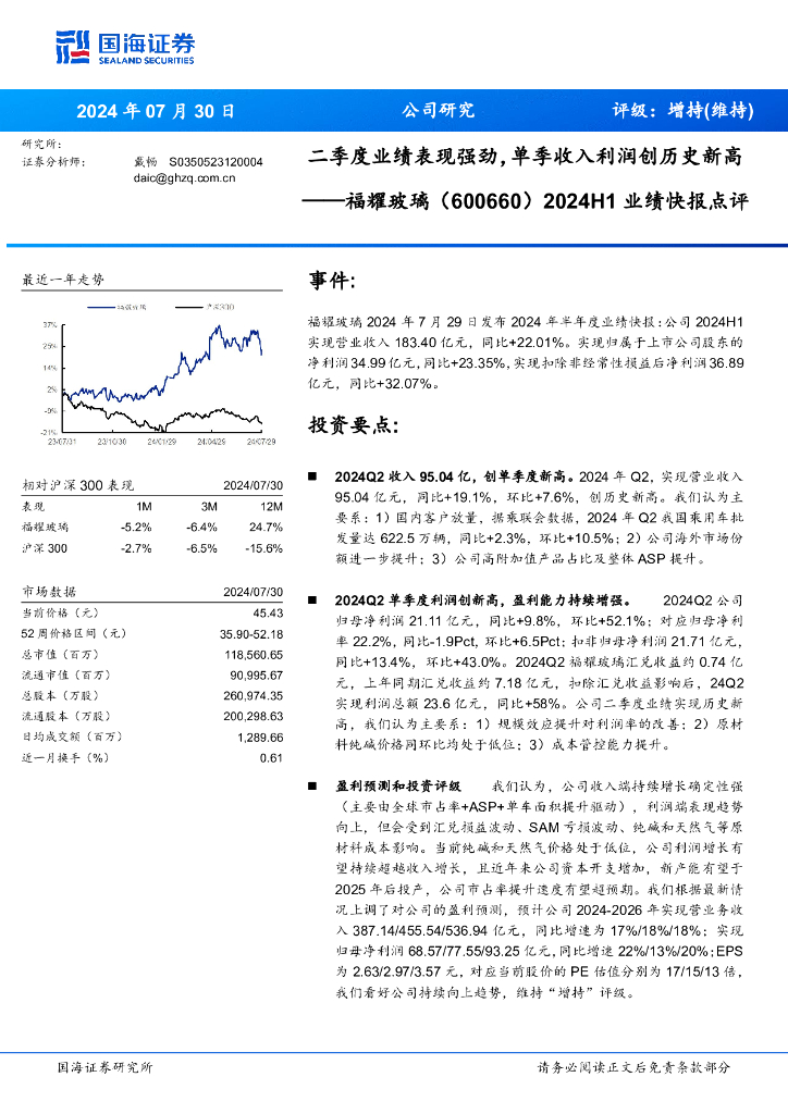 国海证券:福耀玻璃(600660)-2024H1业绩快报点评:二季度业绩表现强劲,单季收入利润创历史新高.pdf