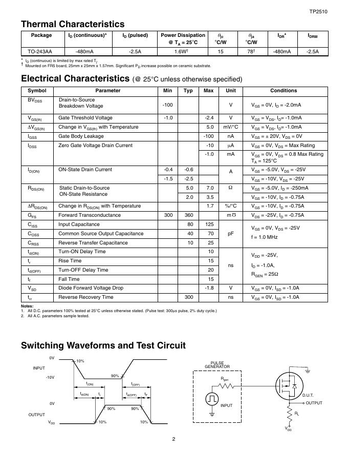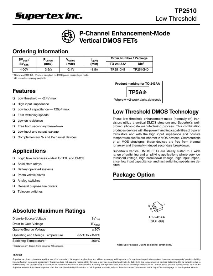 Supertex inc TP2510 Low Threshold P-Channel Enhancement-Mode Vertical DMOS FETs 数据手册.pdf