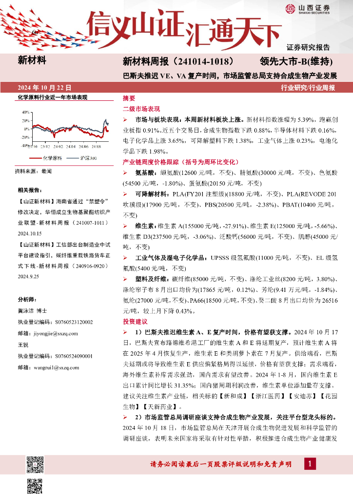 山西证券:新材料行业周报:新材料周报(241014-1018)巴斯夫推迟VE、VA复产时间,市场监管总局支持合成生物产业发展.pdf