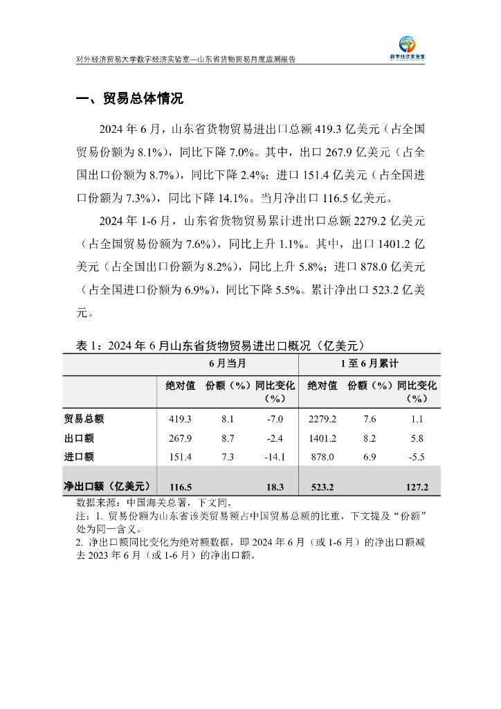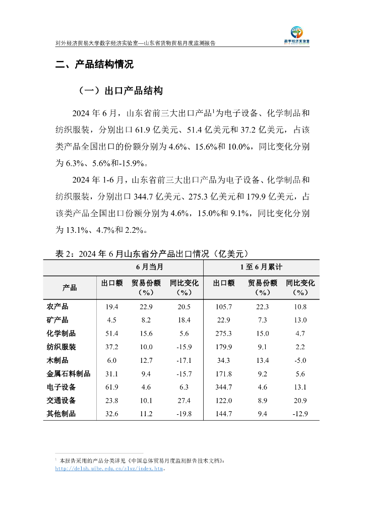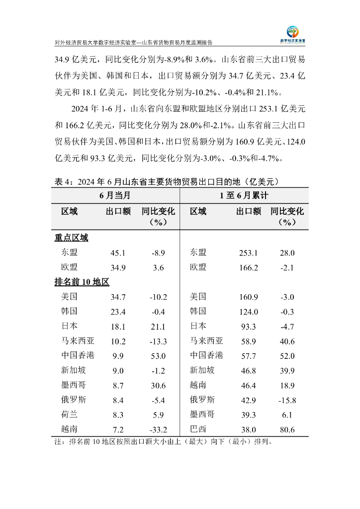 对外经济贸易大学:山东省货物贸易月度监测报告(2024年1-6月).pdf