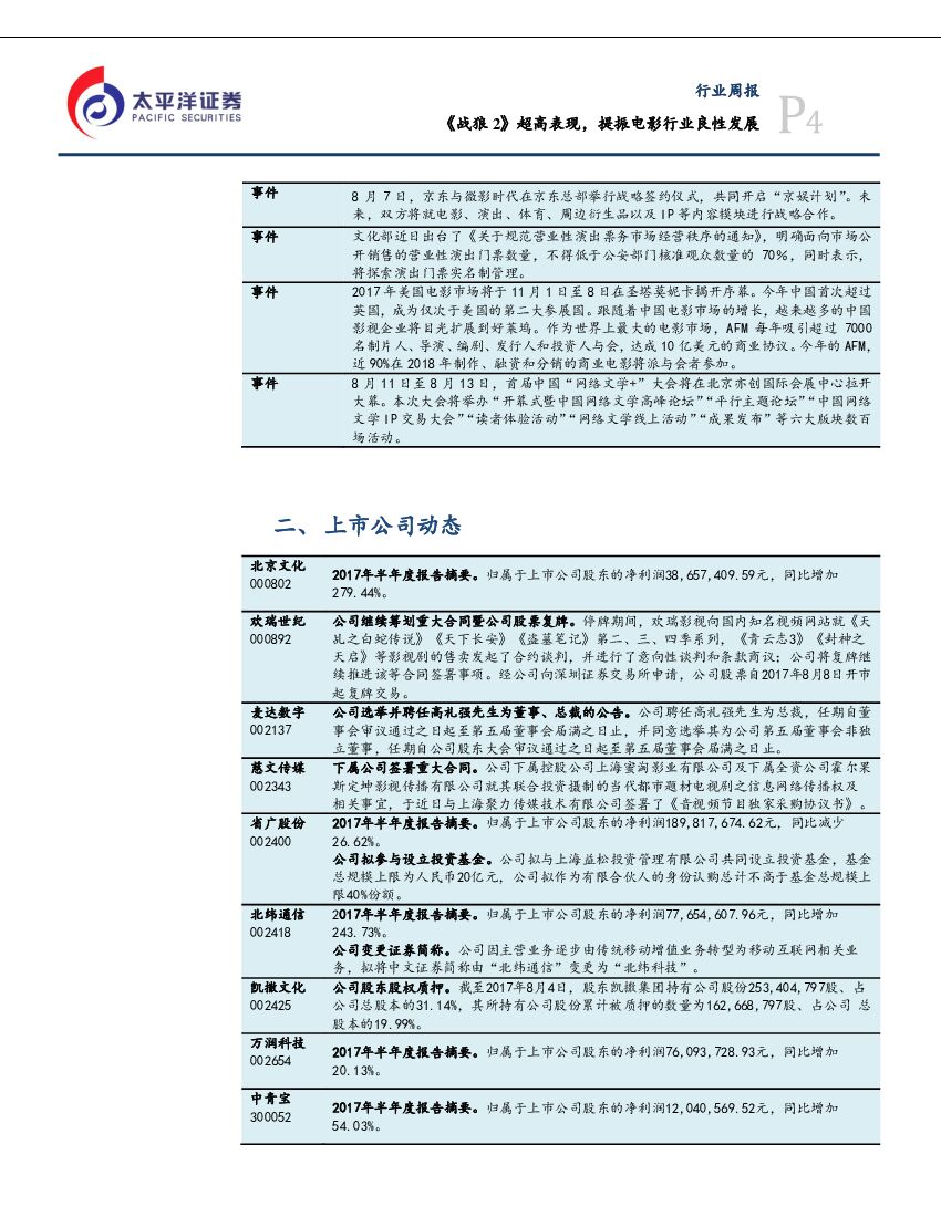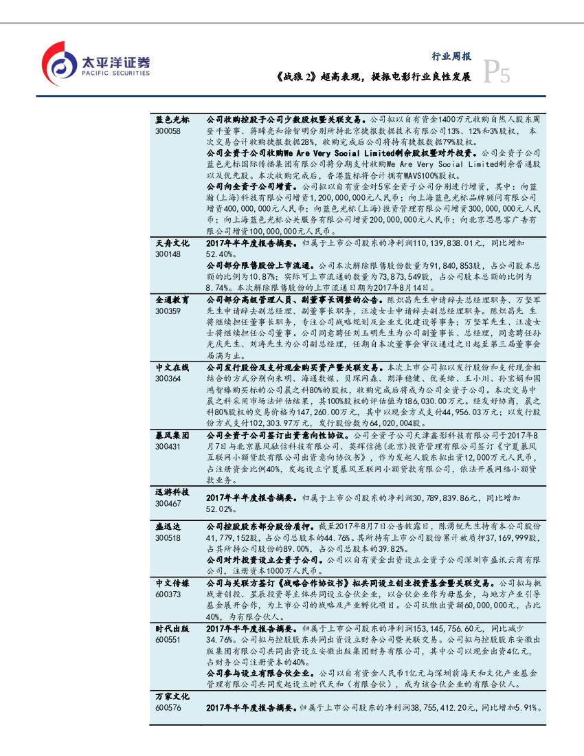 太平洋证券:文化传媒行业周报:《战狼2》超高表现,提振电影行业良性发展.pdf
