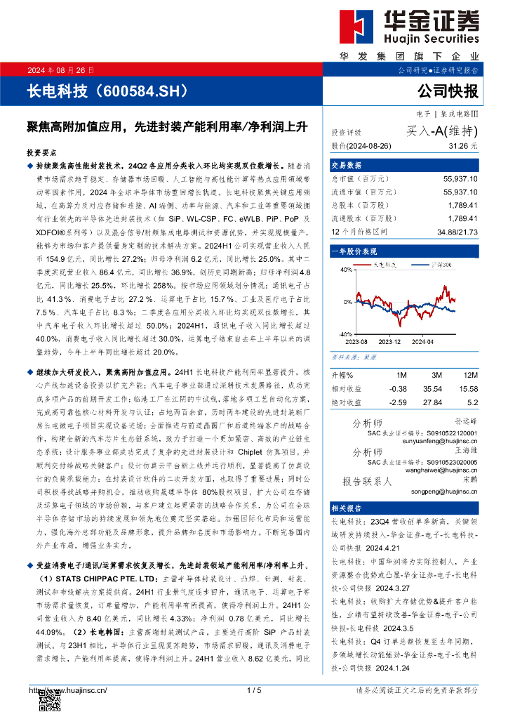 华金证券:长电科技(600584)-聚焦高附加值应用,先进封装产能利用率/净利润上升.pdf