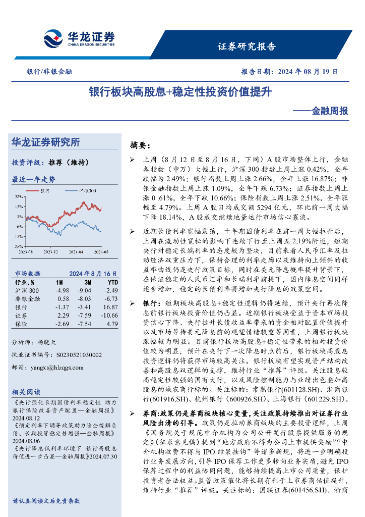 华龙证券:金融周报:银行板块高股息+稳定性投资价值提升.pdf
