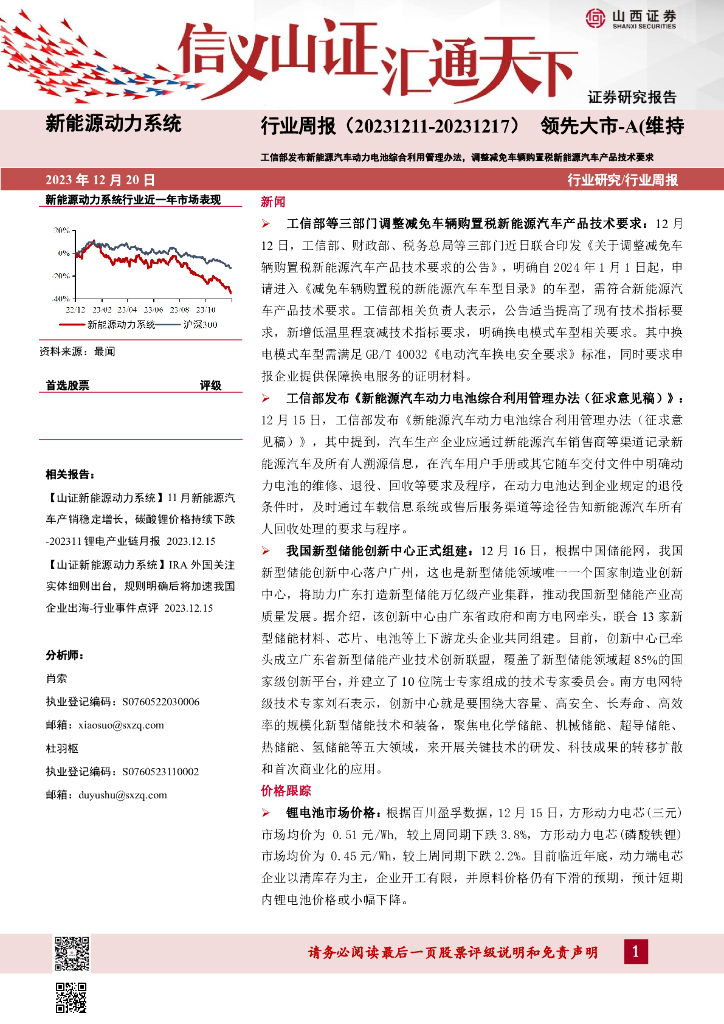 山西证券:新能源动力系统行业周报:工信部发布新能源汽车动力电池综合利用管理办法,调整减免车辆购置税新能源汽车产品技术要求.pdf