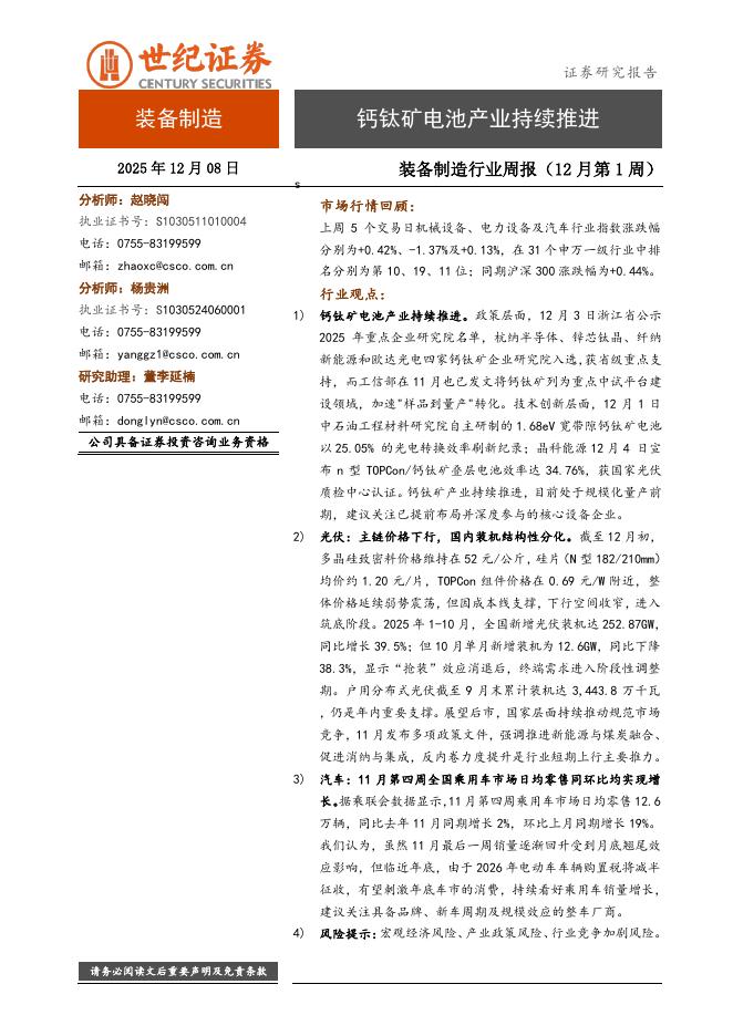 世纪证券:装备制造行业周报(12月第1周):钙钛矿电池产业持续推进.pdf