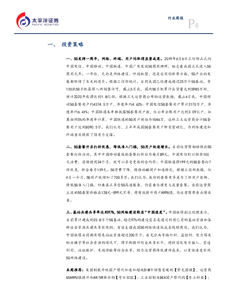 太平洋证券:通信设备Ⅲ行业周报:5G商用一周年,发展彰显“中国速度”.pdf