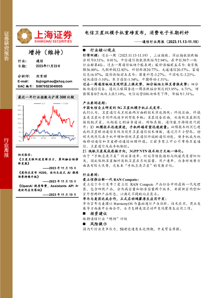 上海证券:通信行业周报:电信卫星双模手机重磅发布,消费电子长期利好.pdf