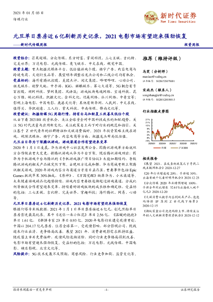 新时代证券:新时代传媒周报:元旦单日票房近6亿刷新历史记录,2021电影市场有望迎来强劲恢复.pdf