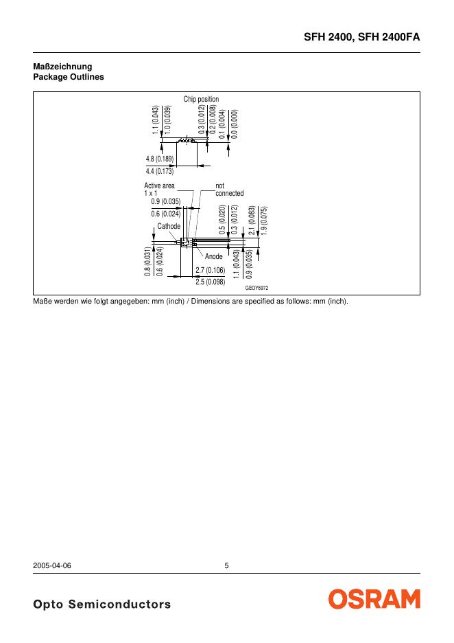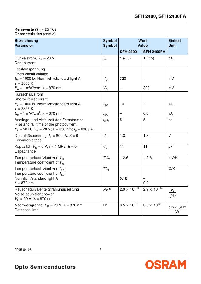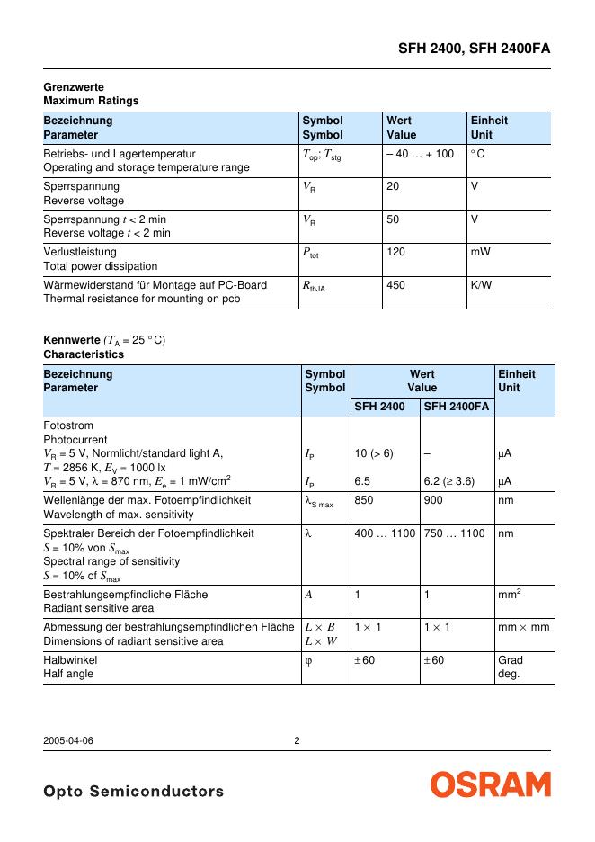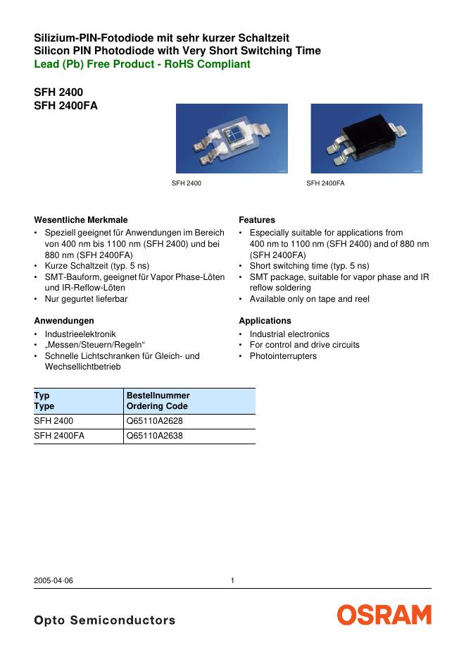 OSRAM SYLVANIA - SFH 2400 SFH 2400FA Silizium-PIN-Fotodiode mit sehr kurzer Schaltzeit 数据手册.pdf