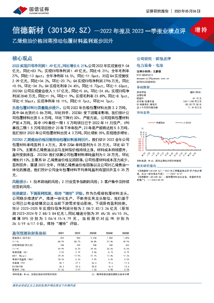 国信证券:信德新材(301349)-2022年报及2023一季报业绩点评:乙烯焦油价格回落推动包覆材料盈利逐步回升.pdf