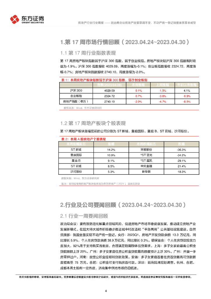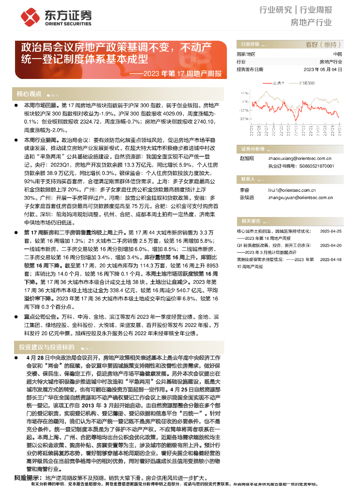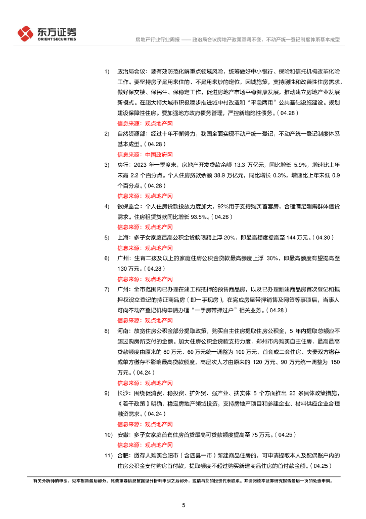 东方证券:房地产行业2023年第17周地产周报:政治局会议房地产政策基调不变,不动产统一登记制度体系基本成型.pdf