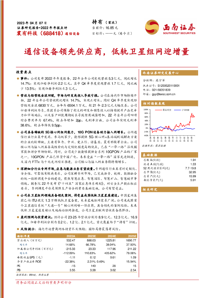 西南证券:震有科技(688418)-通信设备领先供应商,低轨卫星组网迎增量.pdf