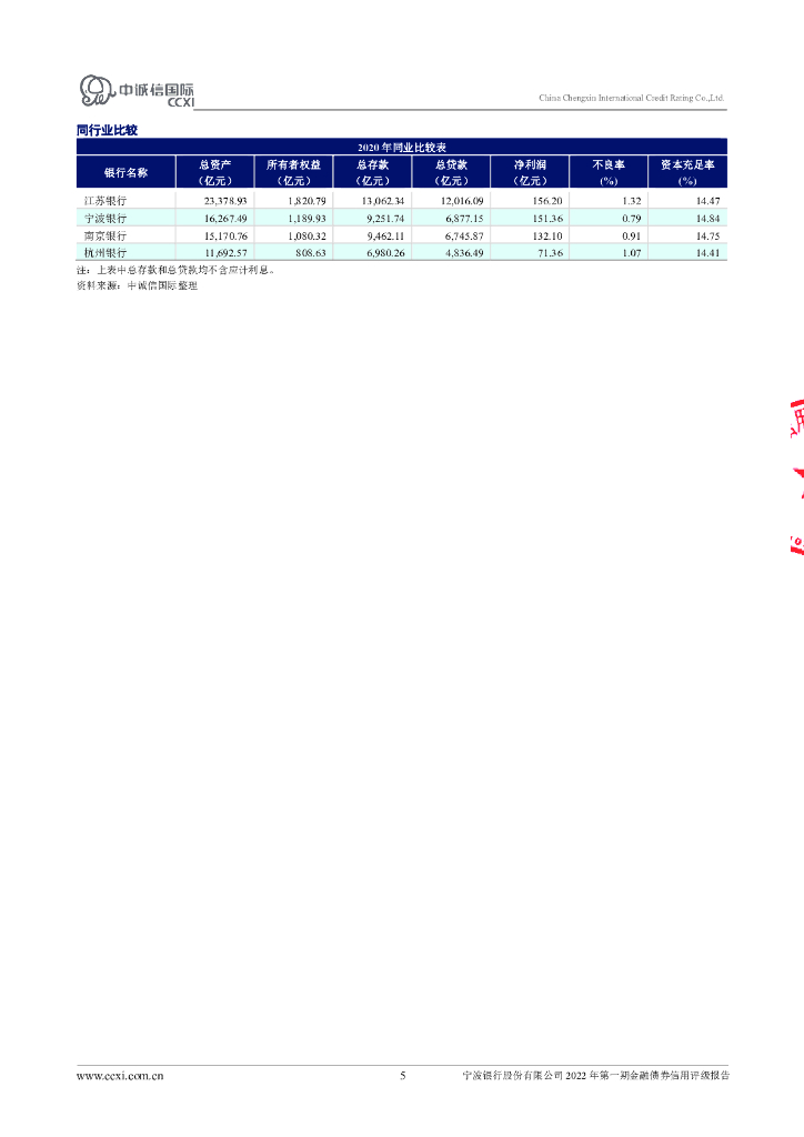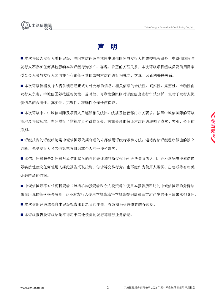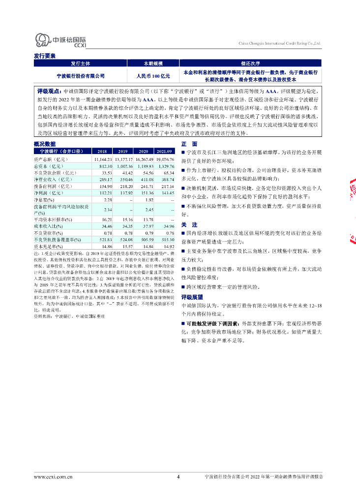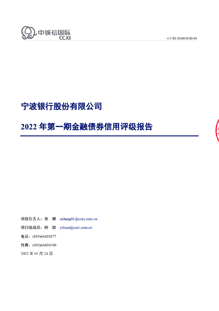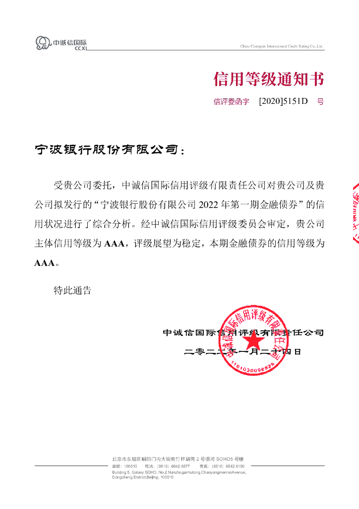 中诚信:宁波银行股份有限公司2022年第一期金融债券信用评级报告及跟踪评级安排.pdf