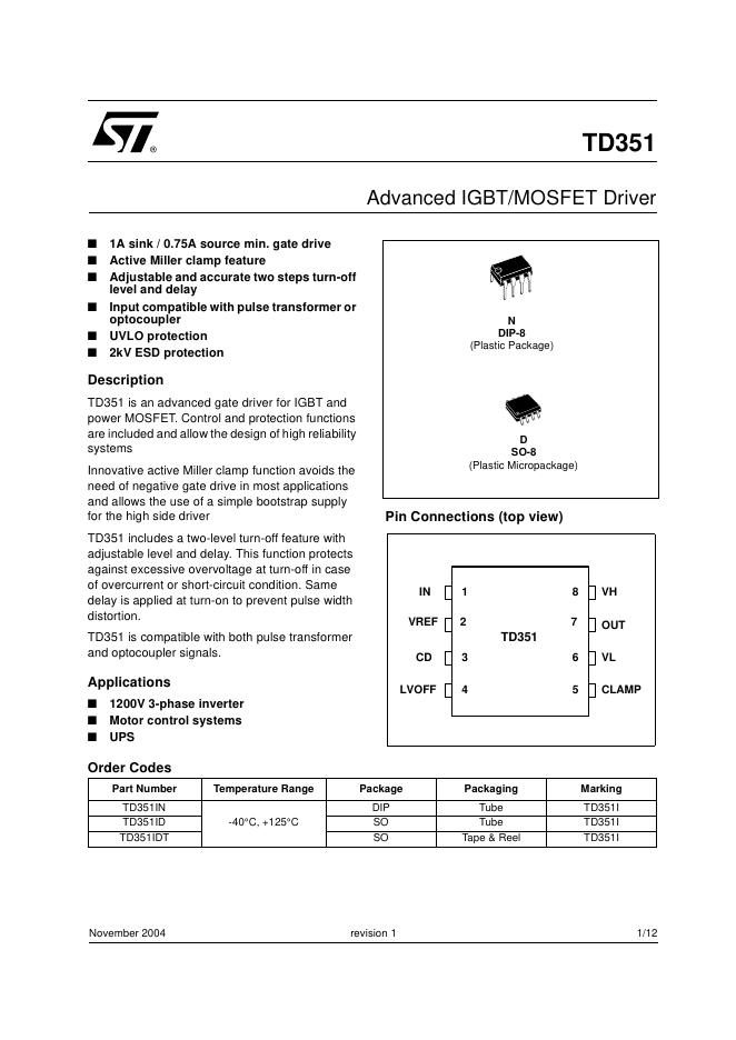STMICROELECTRONICS TD351 Advanced IGBT/MOSFET Driver 数据手册.pdf