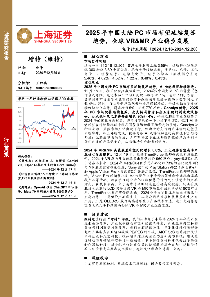 上海证券:电子行业周报:2025年中国大陆PC市场有望延续复苏趋势,全球VR&MR产业稳步发展.pdf