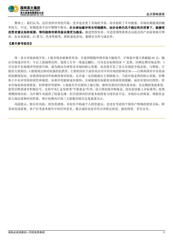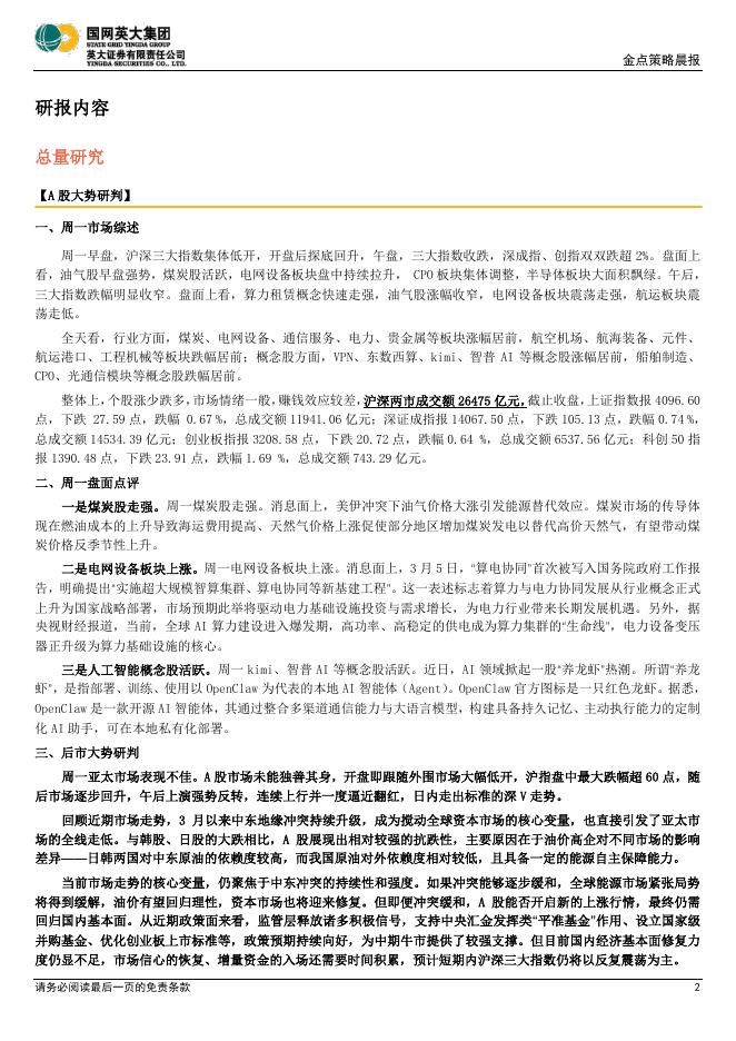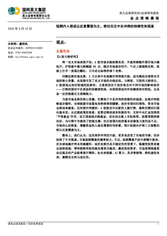 英大证券:金点策略晨报:短期内A股或以反复震荡为主,密切关注中东冲突的持续性和强度-260310.pdf