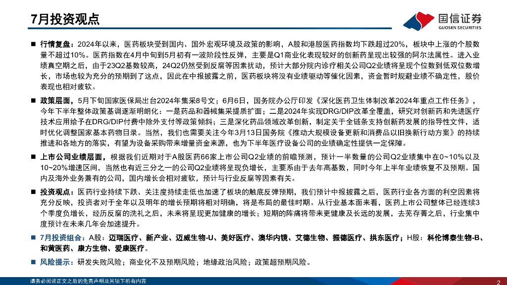 国信证券:2024年生物医药行业二季度业绩前瞻:Q2业绩短期承压,24H2行业见底回升可期.pdf