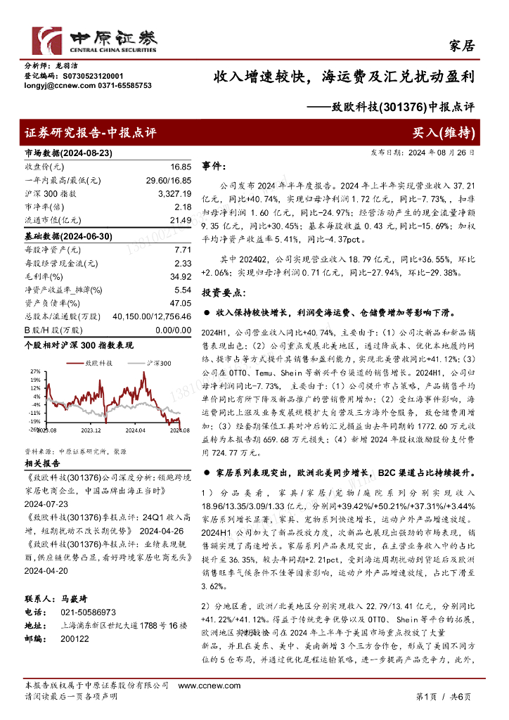 中原证券:致欧科技(301376)-中报点评:收入增速较快,海运费及汇兑扰动盈利.pdf